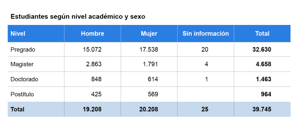 No obstante, la proporción cambia drásticamente en magister, donde se cuentan 2.863 hombres y 1.791 mujeres; y en doctorado, con 848 hombres y 614 mujeres. Esta diferencia se sigue replicando a medida que avanza la trayectoria académica, como se observa en la siguiente tabla: