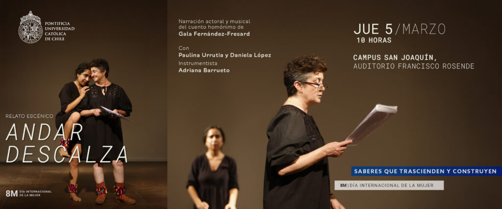 Durante la instancia se presentará el relato escénico titulado “Andar descalza”, narración actoral y musical del cuento homónimo escrito por Gala Fernández-Fresard, profesora de la Escuela de Teatro UC. El relato habla de las mujeres, de la familia, la tierra, sus árboles y la diversidad, todo ello en el contexto de migrar desde la tierra madre para insertarse en un sistema de orden patriarcal. La puesta en escena será protagonizada por las actrices Paulina Urrutia y Daniela López, junto a la instrumentista Adriana Barrueto.